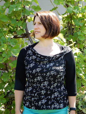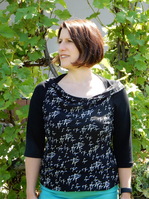 Chris’Nadel-Spiele hat eine Version mit Jerseyärmeln genäht und ich finde auf den Bildern könnt ihr gut sehen, dass das Bündchen am hinteren Halsausschnitt für einen guten Sitz sorgt und dass die Material- und Musterkombination ausgesprochen harmonisch wirkt.