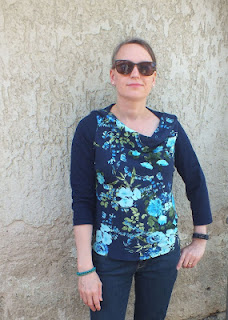 Und zu guter letzt noch eine meiner beiden Probeversionen des Tulpentops, die soweit fertig gestellt wurden, dass ich sie auch tragen kann. Allerdings ärgere ich mich, dass ich bei diesem schönen Tulpentop billigen schwarzen Jersey verwendet habe. Da er komplett ohne Elasthan ist, sitzt er nicht ganz so gut und macht ein “Nachthemdgefühl”. Aber ich mag den Druck der Viskosewebware, der durch das Tulpentop schön präsentiert und in einen Rahmen gesetzt wird, sehr.