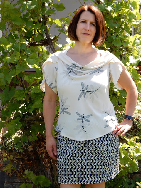 Die zweite Version des Tulpentops von Chris Nadelspiele wird von ihr noch etwas skeptisch betrachtet. Sie fremdelt ein wenig mit den Tulpenärmeln. Sie sagt, sie empfindet ihre Schultern zu betont, “wie ein Preisboxer”, nun das sehe ich nicht so. Es ist eben eine ungewohnte Silhouette, aber ich finde es sehr zart und weiblich und vor allen Dingen sehr gut gestyled und der richtige Look zu dem zarten, hellen Stoff mit den zarten Libellen.