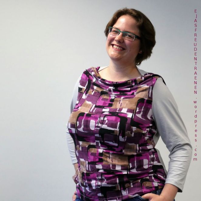 Und zu guter letzt noch eine meiner beiden Probeversionen des Tulpentops, die soweit fertig gestellt wurden, dass ich sie auch tragen kann. Allerdings ärgere ich mich, dass ich bei diesem schönen Tulpentop billigen schwarzen Jersey verwendet habe. Da er komplett ohne Elasthan ist, sitzt er nicht ganz so gut und macht ein “Nachthemdgefühl”. Aber ich mag den Druck der Viskosewebware, der durch das Tulpentop schön präsentiert und in einen Rahmen gesetzt wird, sehr.